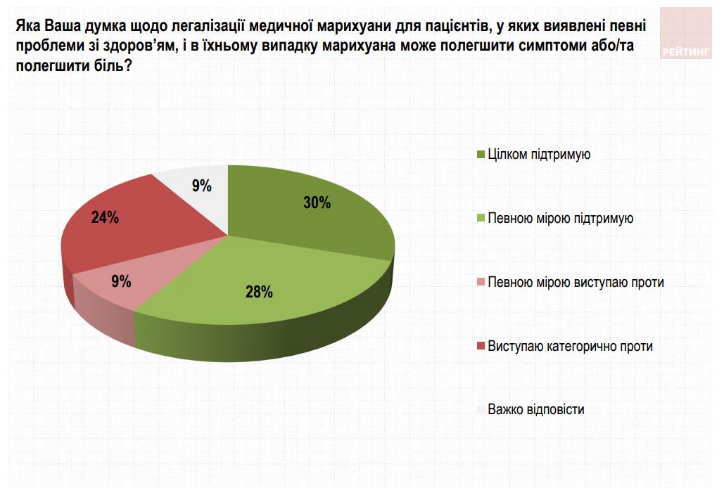 30% опрошенных украинцев полностью, а 28% в определенной степени поддерживают возможную легализацию медицинской марихуаны в Украине для пациентов, которым она сможет облегчить симптомы и/или облегчить боль.