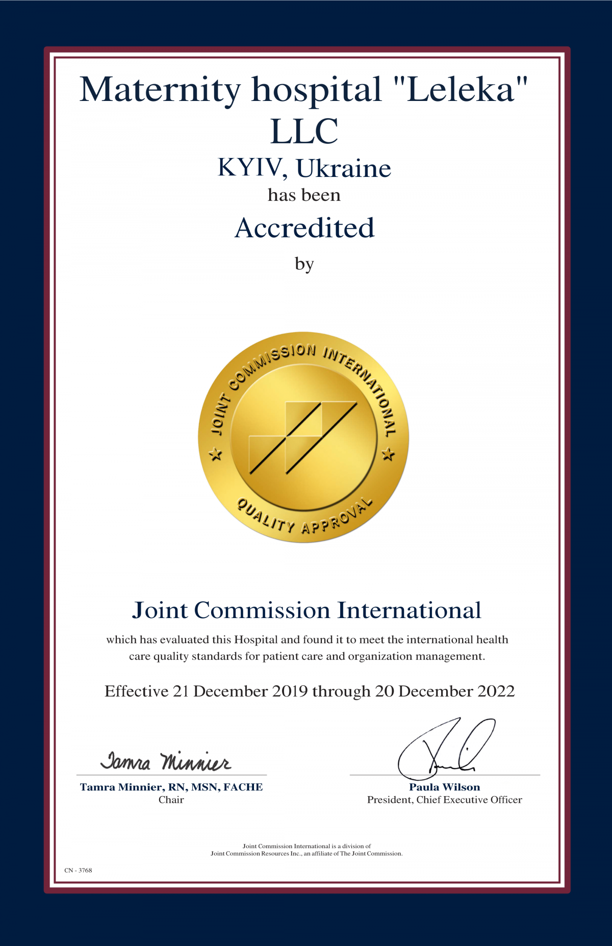 Гендиректор заведения отметил, что с 16 по 20 декабря 2019 года эксперты Международной объединенной комиссии провели всестороннюю детальную проверку, во время которой проверяется все - от дипломов врачей и маркировки лекарств до мер противопожарной безопасности. И по результатам этой проверки родильный дом «Лелека» стал первым госпитальным медицинским заведением в Украине, получившим международный сертификат JCI, который является первый с точки зрения международного признания.