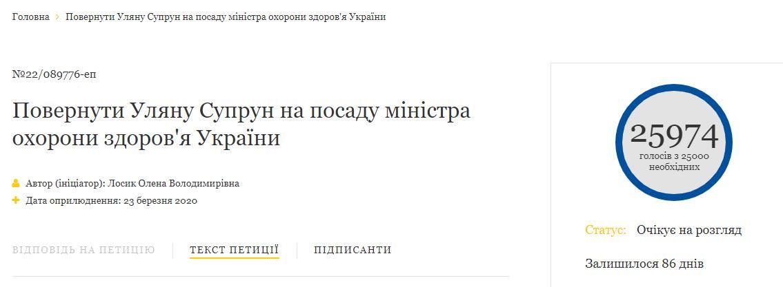 Петиция на сайте президента Украины Владимира Зеленского о восстановлении Уляны Супрун в должности главы Минздрава набрала необходимое количество подписей - 25 тысяч.