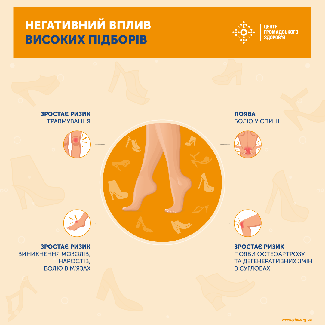 "Высокие каблуки - эффектный элемент стиля женщины. Но будьте осторожны - частое ношение обуви на высоком каблуке, которое еще и вызывает у вас дискомфорт, может обернуться вредом для здоровья", - отметили в пресс-службе ЦОЗ в Facebook.