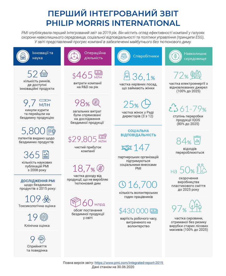 Компания Philip Morris International Inc. (PMI) опубликовала первый Интегрированный отчет за 2019 год. Он содержит комплексный обзор эффективности и прогресс компании в области охраны окружающей среды, социальной ответственности и политики управления (принципы ESG).