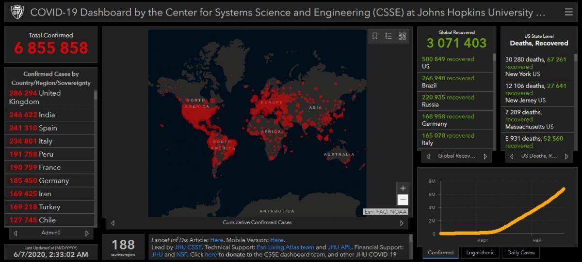 Всего в мире с начала эпидемии зафиксировано 6 855 858 инфицированных.