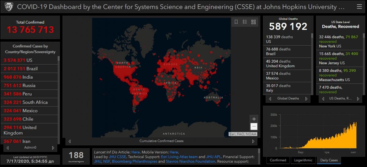 Согласно данным института Джона Хопкинса, по состоянию на утро 17 июля в мире было зарегистрировано 13 765 713 инфицированных и 589 192 умерших, 7 679 786 выздоровевших.