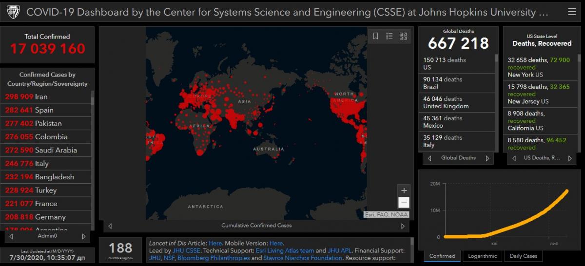 Всего с начала эпидемии в мире подтвердили 17 039 160 случаев инфицирования COVID-19, 667 218 из них – летальные, 9 974 949 человек выздоровели.